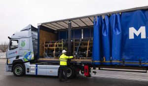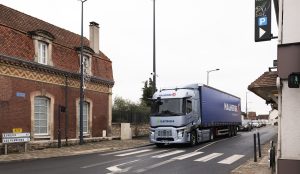 Elektrikli kamyonlar, Lyon‘daki fabrikalardan alınan motorları ve aksları Blainville-sur-Orne‘deki Renault Trucks fabrikasına teslim etmek üzere Vironvay’deki Malherbe deposundan ayrılıyor.